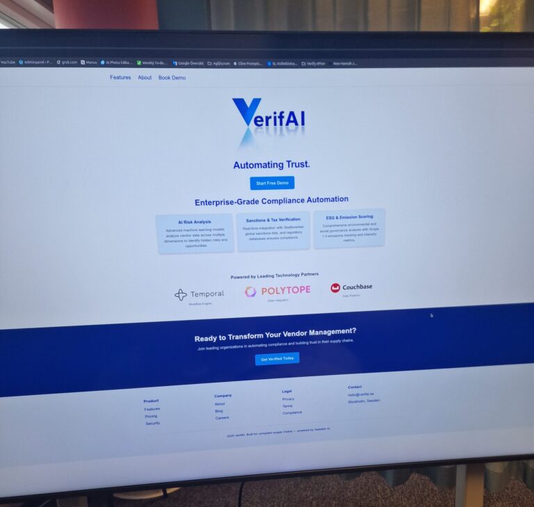 I built a platform that automates trust for business partnerships. Let me explain the problem first. Right now, when companies or public organizations want to work with a new supplier or business partner, they have to go through this incredibly slow, manual process to verify that the partner is trustworthy and follows all the rules. This onboarding process typically takes six weeks to six months, costs a fortune (the global cost is estimated at 2.2 billion dollars by the end of 2024), and is risky because manual, static checks often miss important changes—like new sanctions or tax issues.